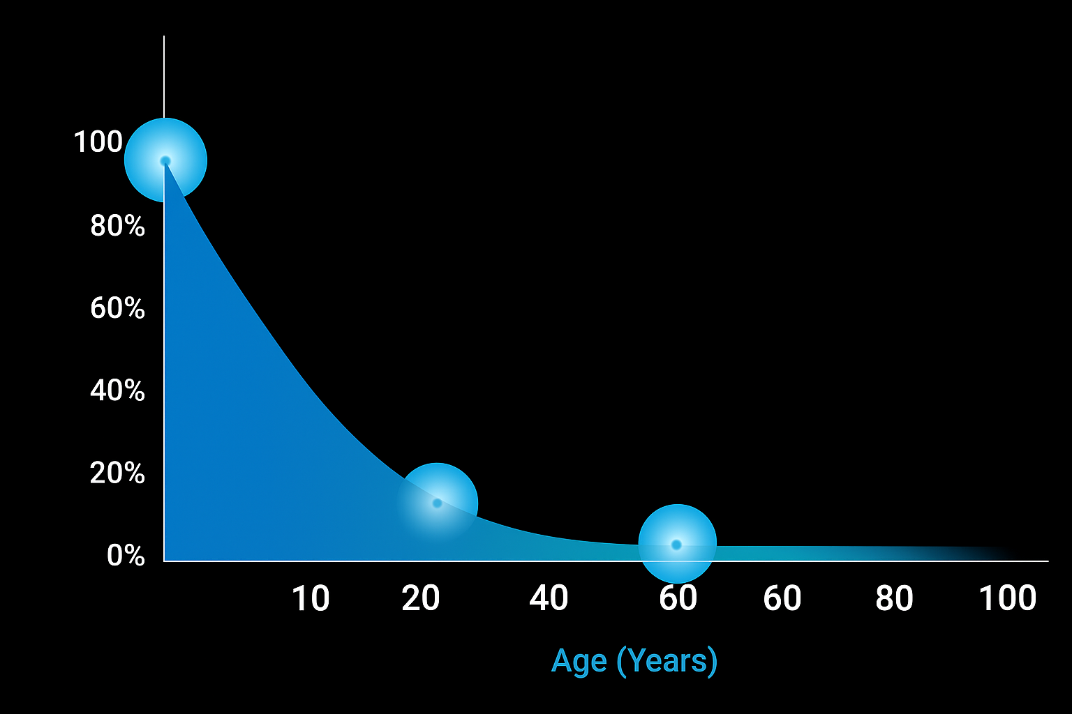 As we get older, our body’s natural repair ability begins to decline. Just as the immune system protects us from illness, the body has its own repair system powered by stem cells-the master cells responsible for renewing and restoring every organ and tissue each day. This system is what maintains our health, energy, and longevity. However, with age, the number and activity of stem cells decrease dramatically. By the time you reach your 30s, you may have already lost up to 90% of your stem cells, which is why you start to notice that your body doesn’t heal or recover as quickly as it once did.